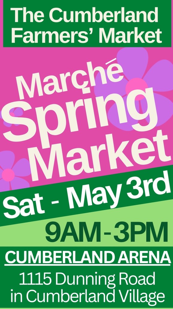 We Iβll be at the Cumberland spring market this Saturday 9 to 3pm the market will be in doors. Come visit us and get your Motherβs Day gift s .