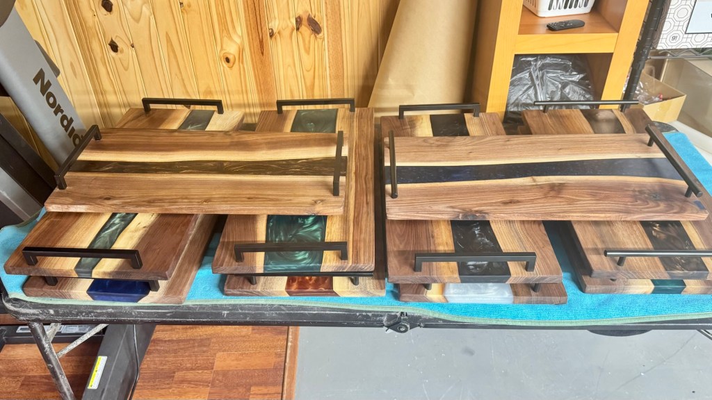 We are a home based small business specializing in charcuterie boards made from various local wood such as black walnut, maple, black cherry, ash and many others. Many of our boards have resin work and we are more than happy to customize one for you. Resin has added many items to our product line as we learn how to create unique pieces with resin.