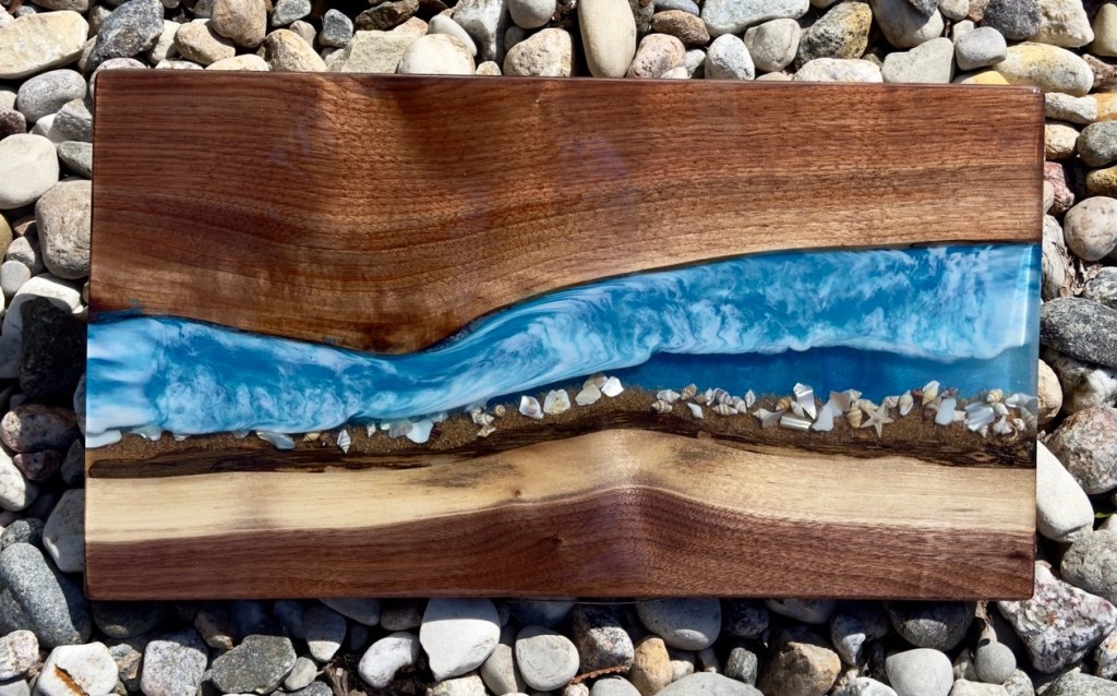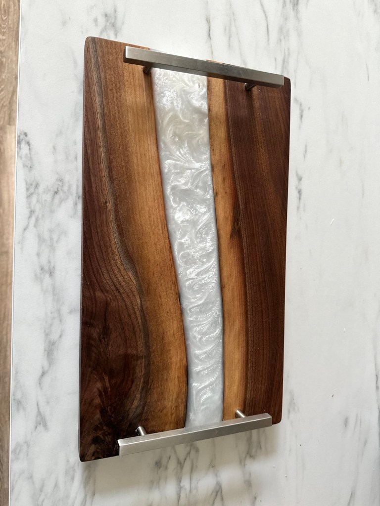 Charcuterie Boards We have a variety of board to choose from. 18”x12” copper charcuterie board $95.00 Acacia Wood cutting board Black walnut oval 36” 18”x12” resin Charcuterie board Custom colours available. $120.00 with handles $95.00 without handles Black walnut 12”x12” $80.00 custom colours available Custom beach board $150.00 contact to order
